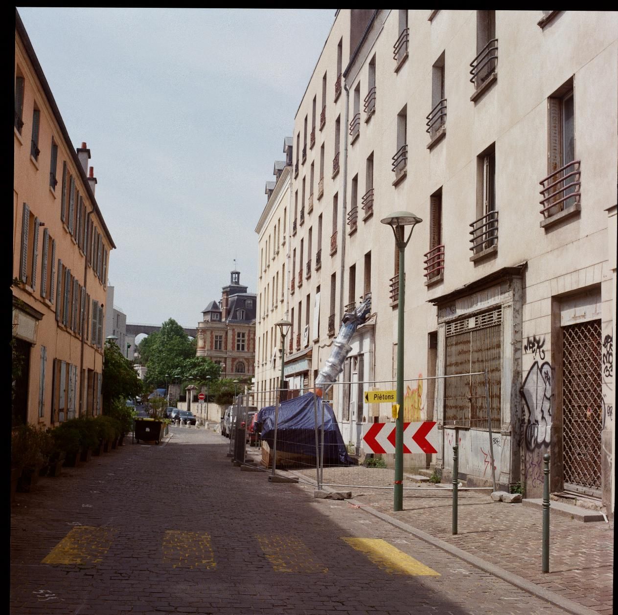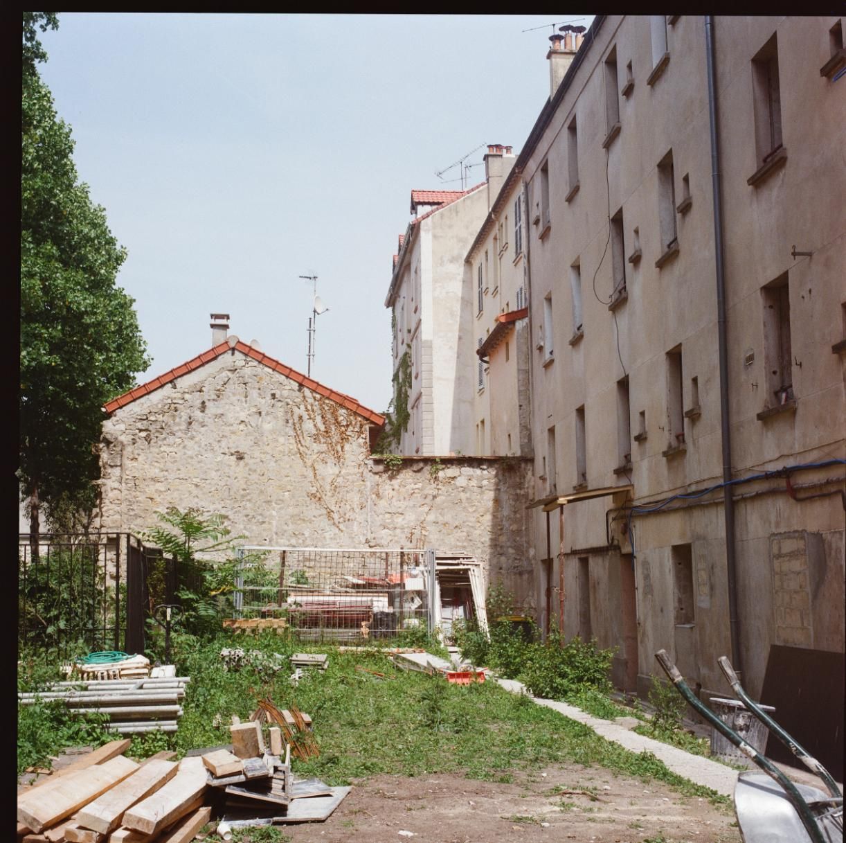 En effet, une première extension au-dessus du niveau 3 du bâtiment 17 de la rue Cauchy, qui s’aligne à la hauteur du pignon voisin le 19, permet de redonner un certain dynamisme à la rue, par son effet de retrait par rapport à l’existant et sa matérialité qui contraste avec l’enduit chaux. Cette extension est en structure et revêtement bois peint, intéressant pour la légèreté de ce matériau, et aussi par le fait qu’elle se lit ainsi comme un attique, qui pourrait rappeler les séchoirs du vieil Arcueil.