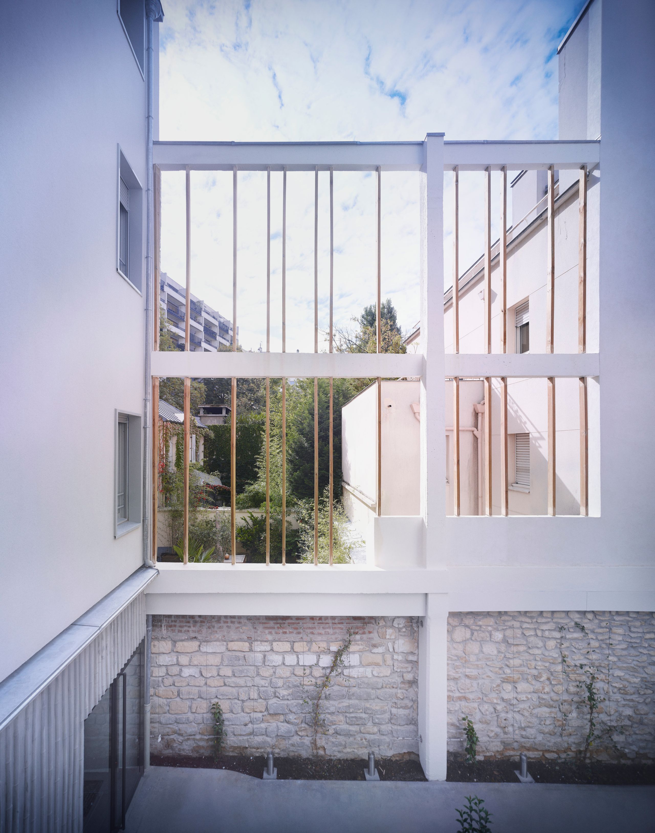 Le projet comporte la restructuration du bâtiment existant pour créer douze logements sociaux, en utilisant le volume d’origine. Dans ce volume contraint, nous créons une cour côté sud et une cour coté est, positionnées dans la continuité des cours des parcelles voisines. Ce dispositif permet de désenclaver spatialement notre parcelle et d’éclairer naturellement les logements projetés.