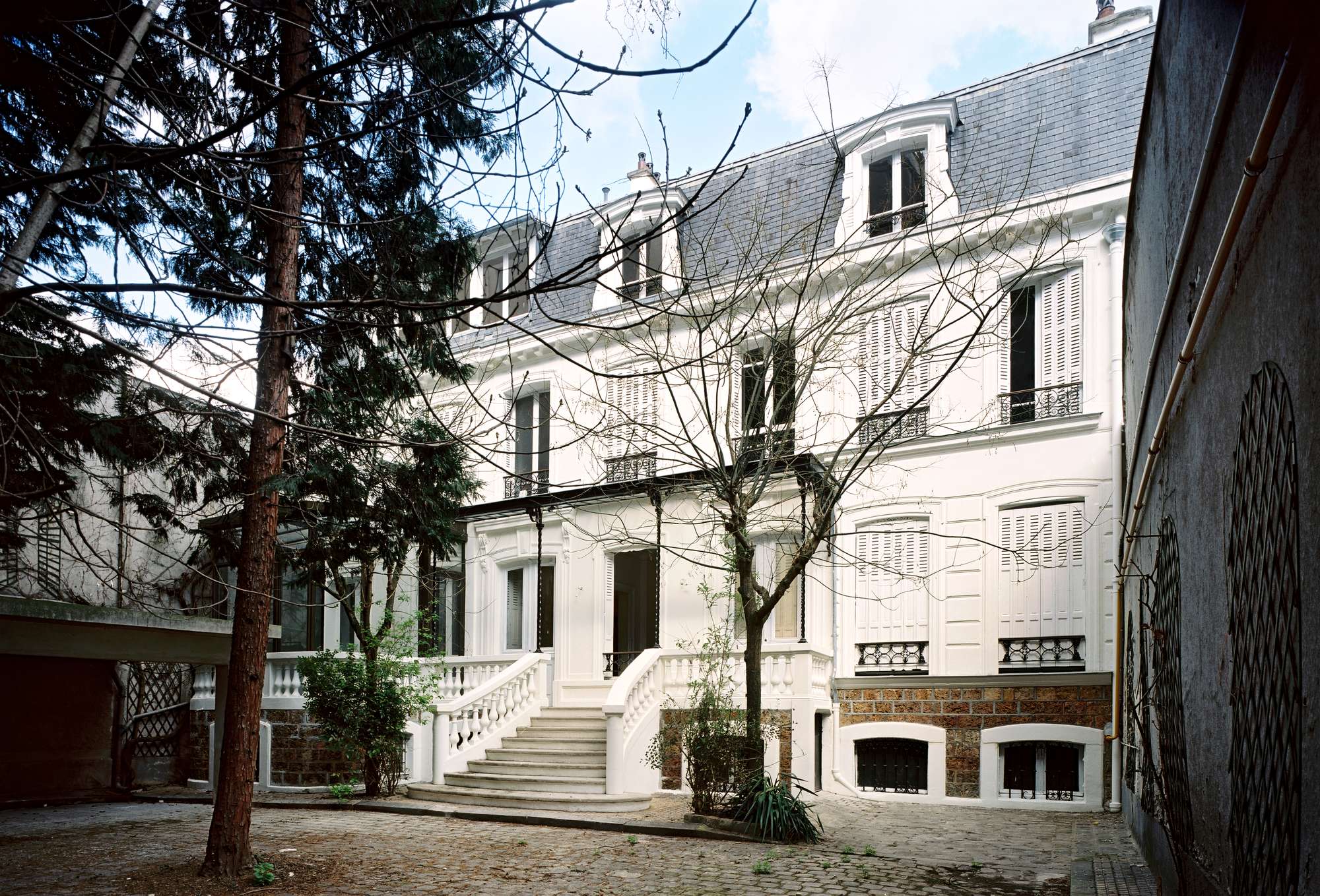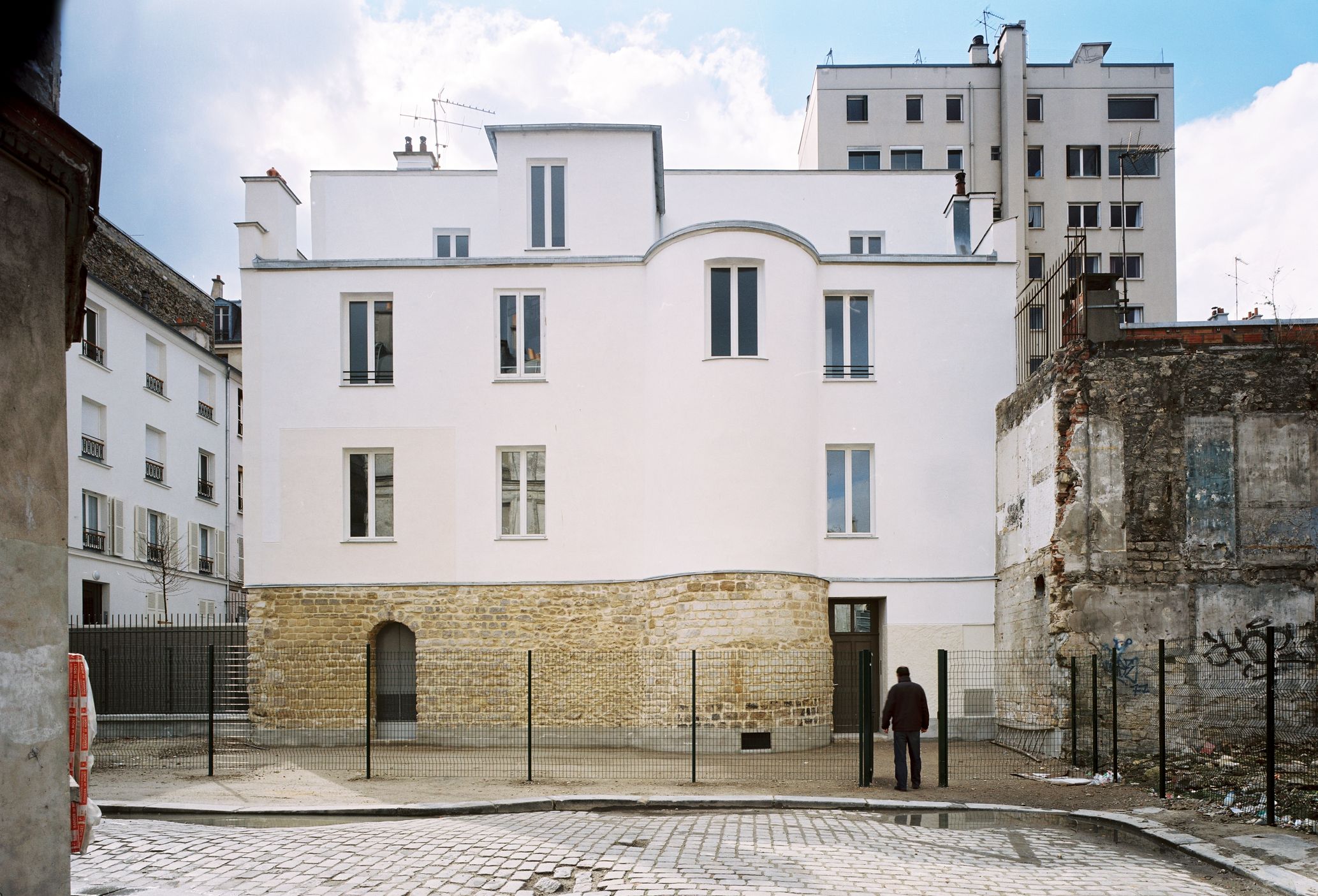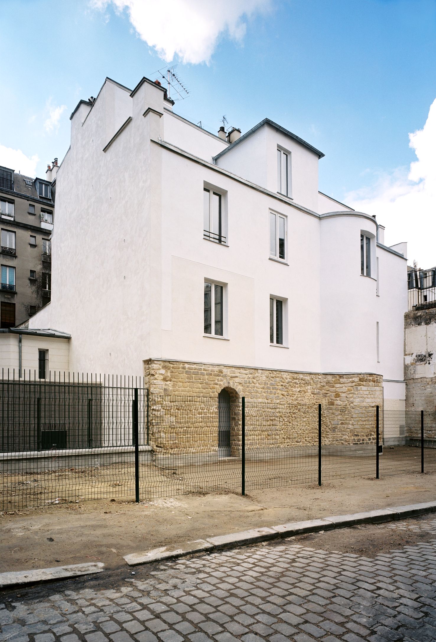 Le projet s’inscrit dans un périmètre de Droit de Préemption Urbain Renforcé. A ce titre la façade sur rue a été entièrement recomposée et met en contraste l’ancien et puissant soubassement de pierre, exhumé et mis en valeur sur la rue, avec le reste de la façade composé de stuc blanc à la chaux. La façade sur cour a été restaurée à l’identique ainsi que l’intérieur du bâtiment.