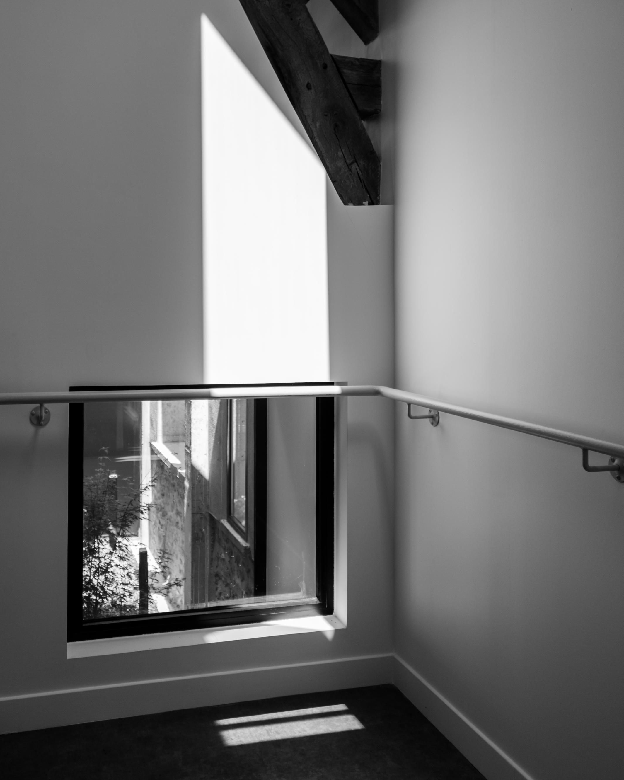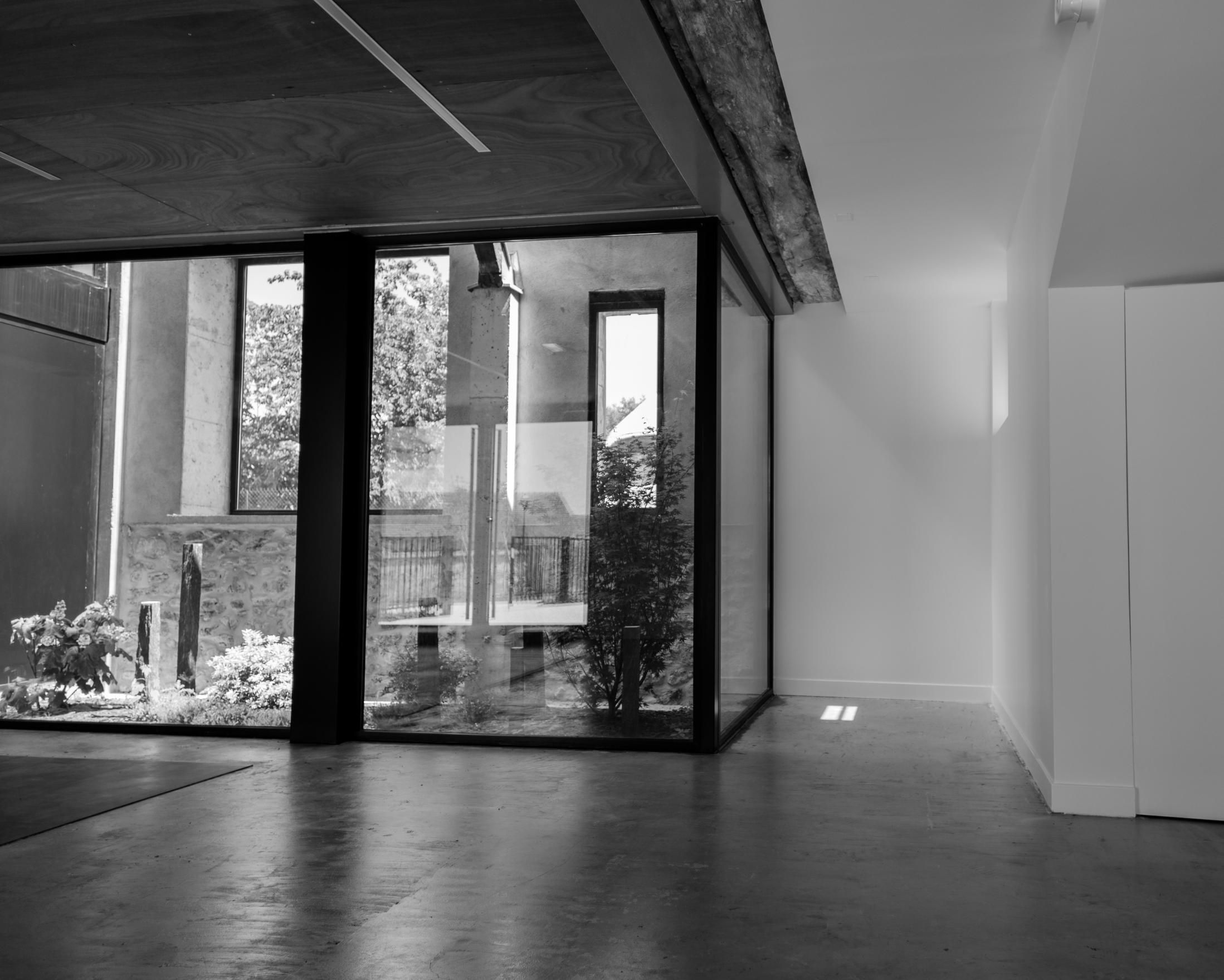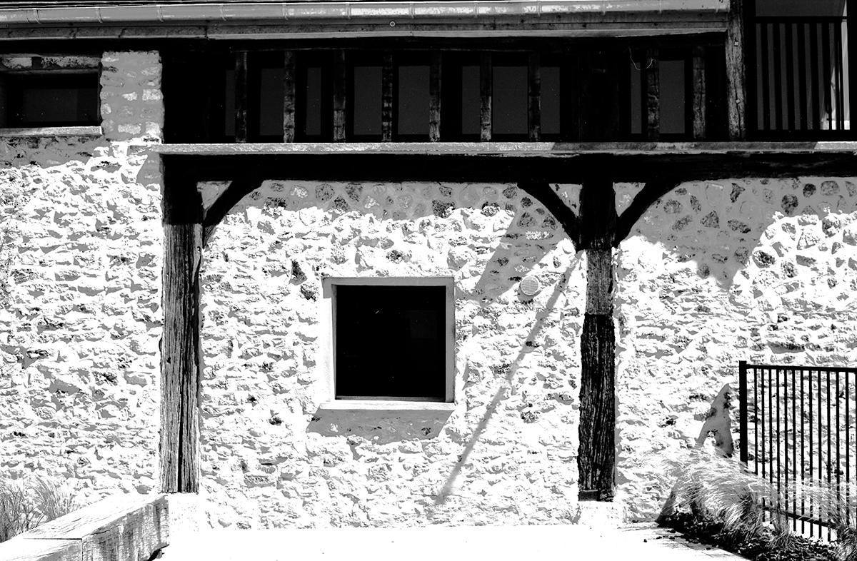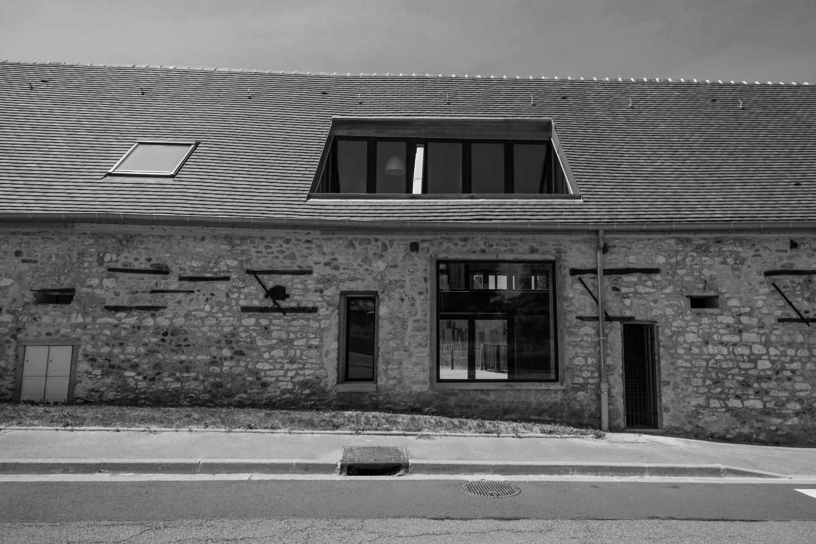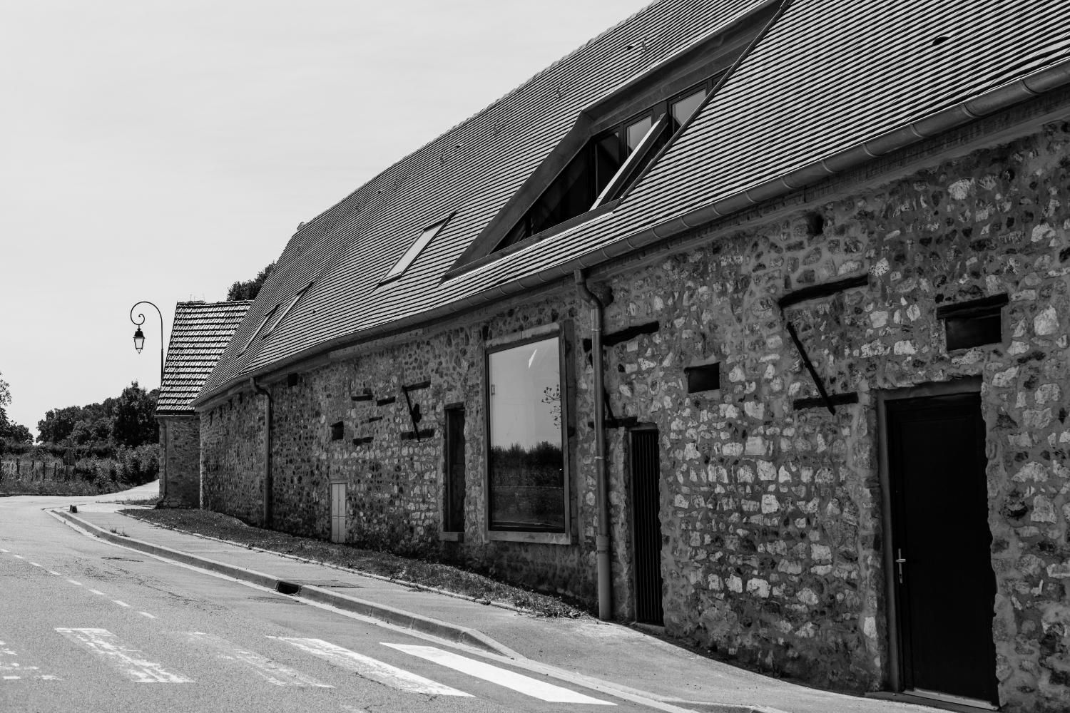 Pour l’aménagement de la longère l’architecte, Pierre Lépinay, a pris le parti de conserver la majorité de la structure existante et de minimiser les interventions sur les façades. La lumière est prise par des patios, créés derrière les parois de pierre des façades.