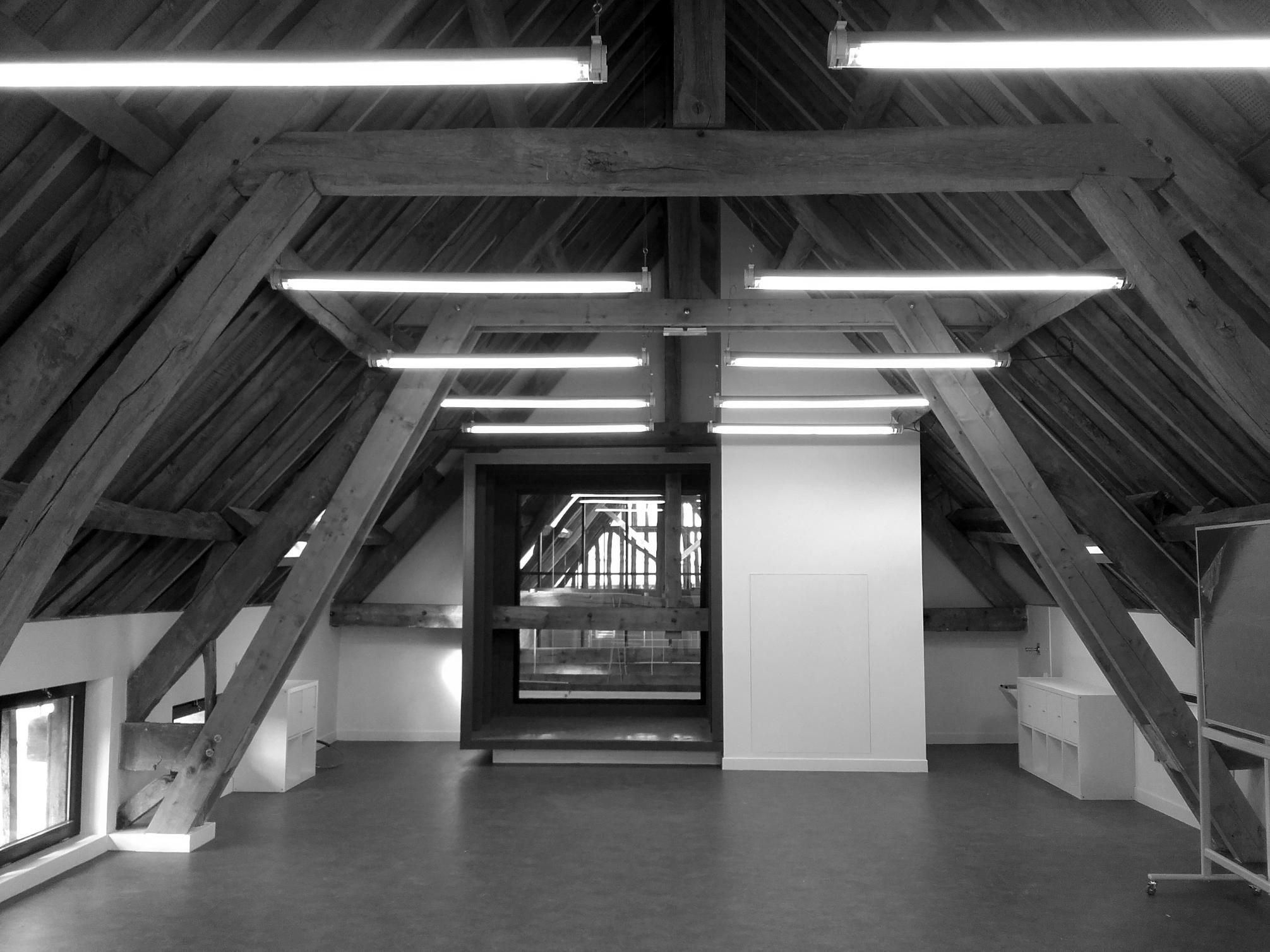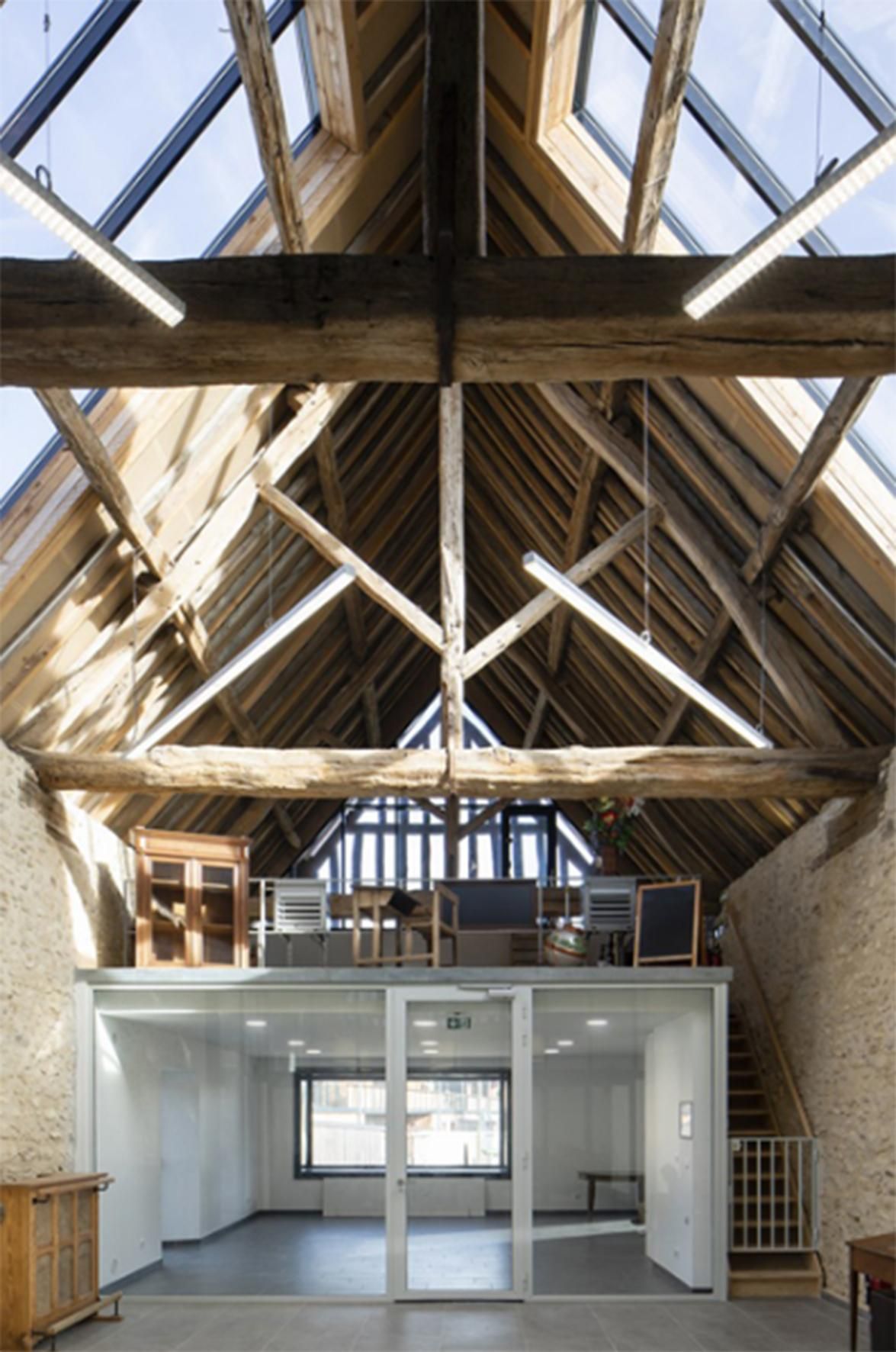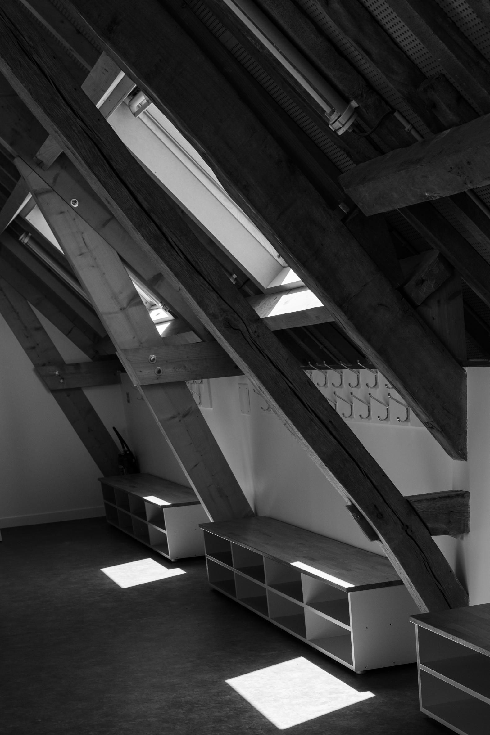 Dans la partie sud, on trouve les salles de classe, situées dans le magnifique volume sous charpente. Une estrade est créée dans la classe principale, propice à la récitation et prétexte à une ouverture spectaculaire sur l’ensemble des charpentes en enfilades qui se développent dans la longueur du bâtiment. Cette idée est venue d’une peinture que Pierre Lépinay a réalisée il y a une quinzaine d’année et qui a trouvé sa mise en forme dans ce projet.