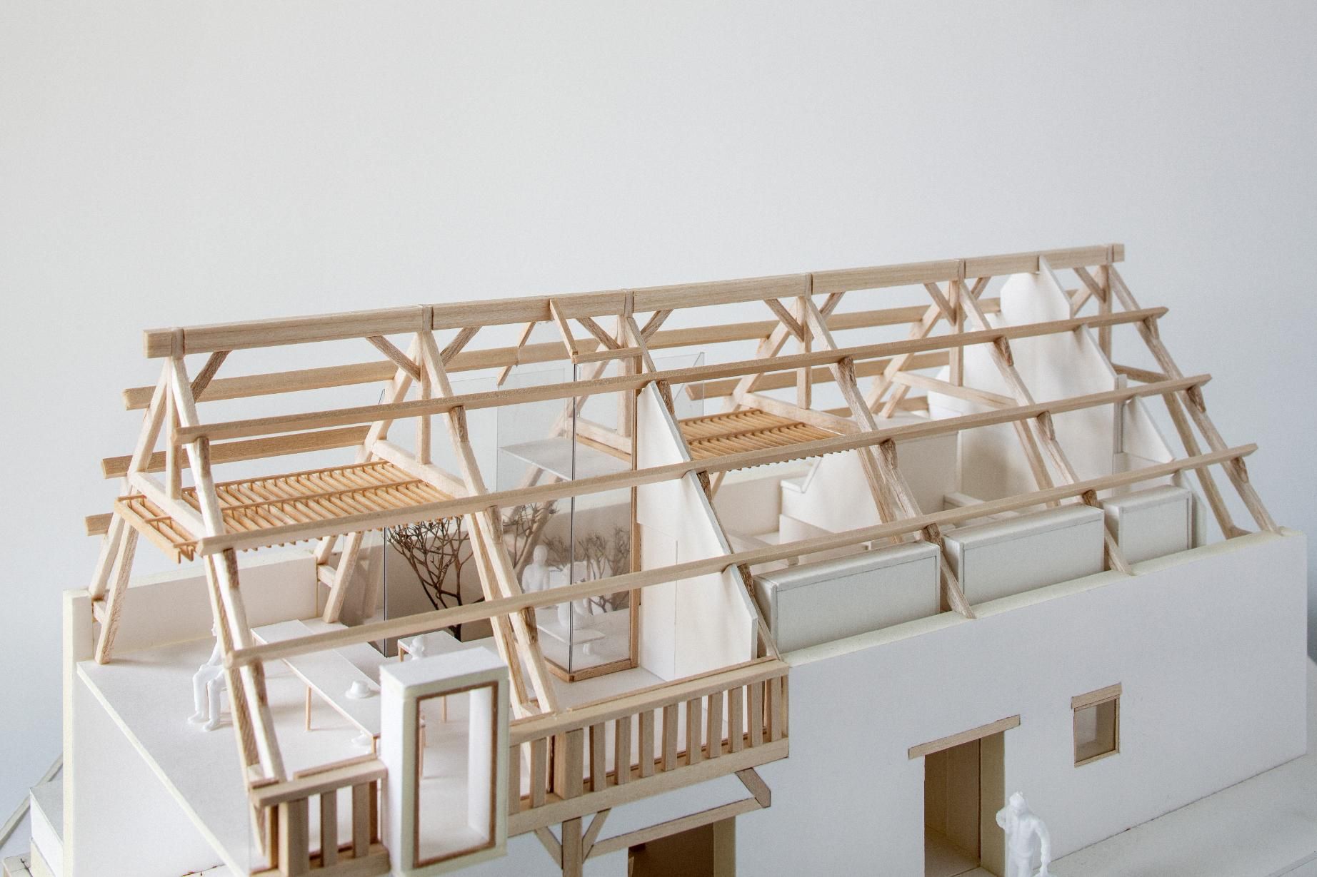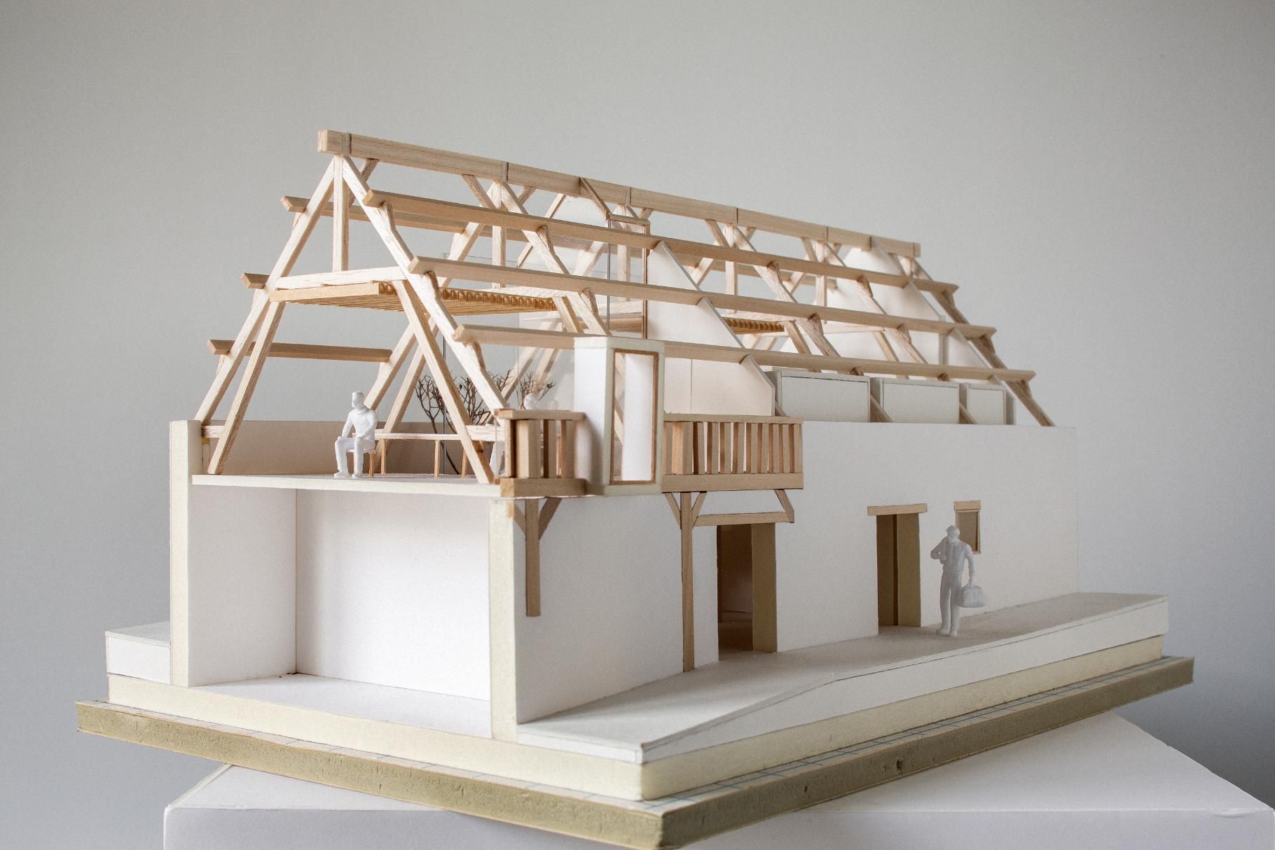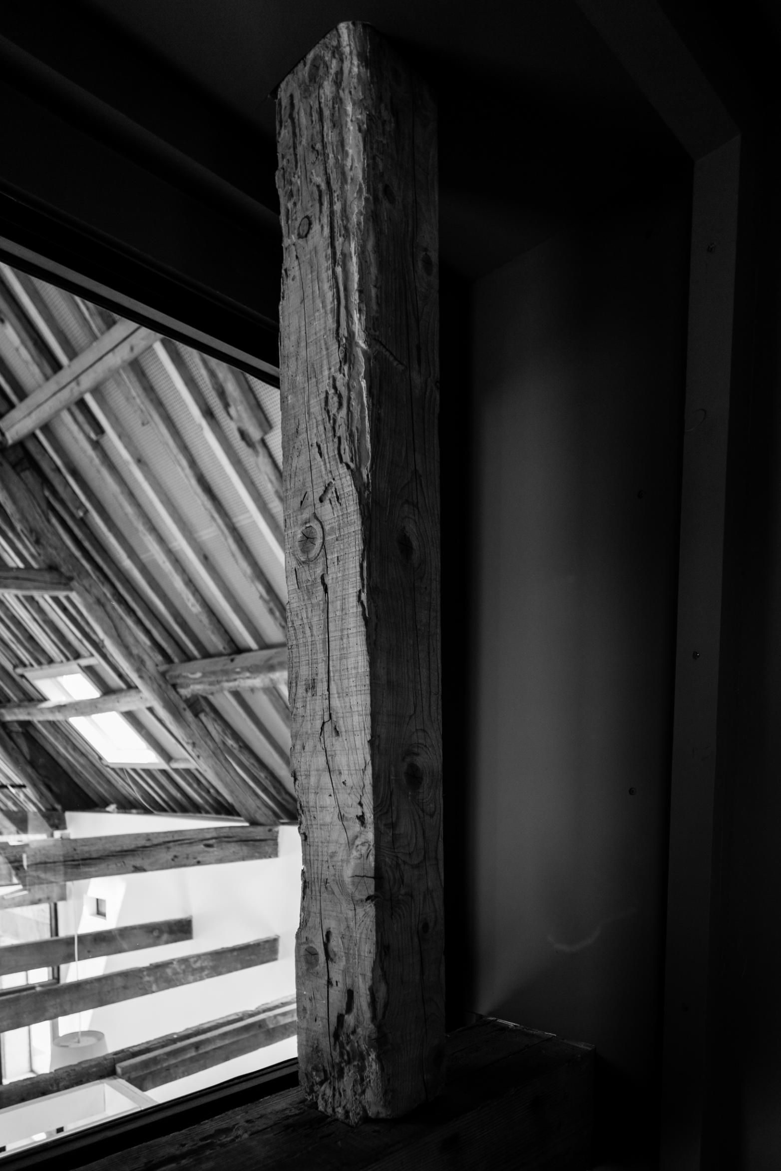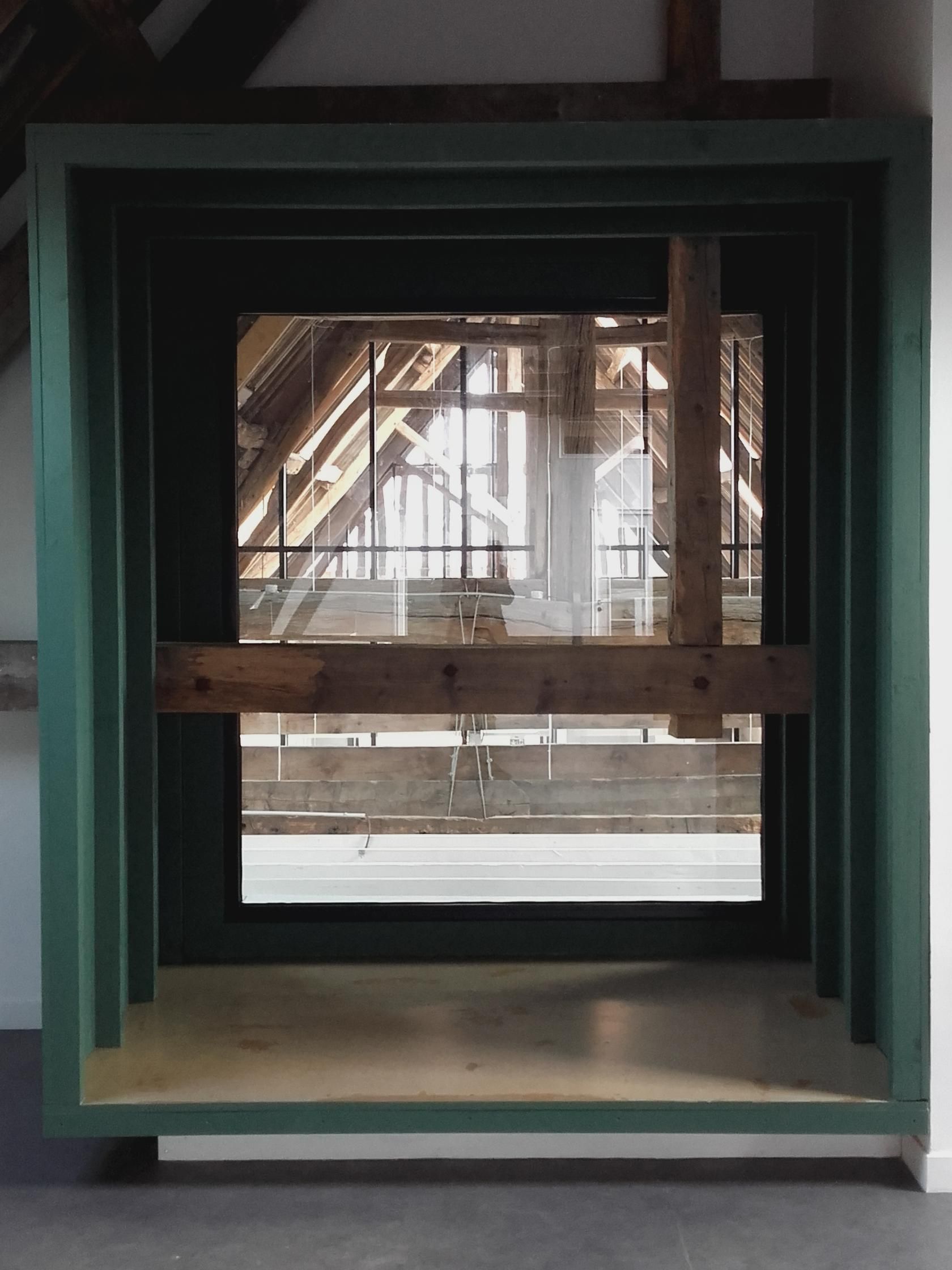 Dans la partie sud, on trouve les salles de classe, situées dans le magnifique volume sous charpente. Une estrade est créée dans la classe principale, propice à la récitation et prétexte à une ouverture spectaculaire sur l’ensemble des charpentes en enfilades qui se développent dans la longueur du bâtiment. Cette idée est venue d’une peinture que Pierre Lépinay a réalisée il y a une quinzaine d’année et qui a trouvé sa mise en forme dans ce projet.