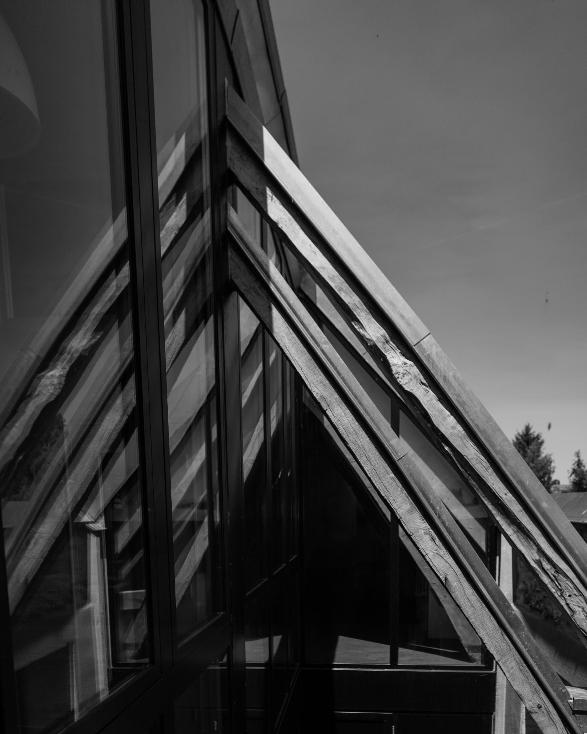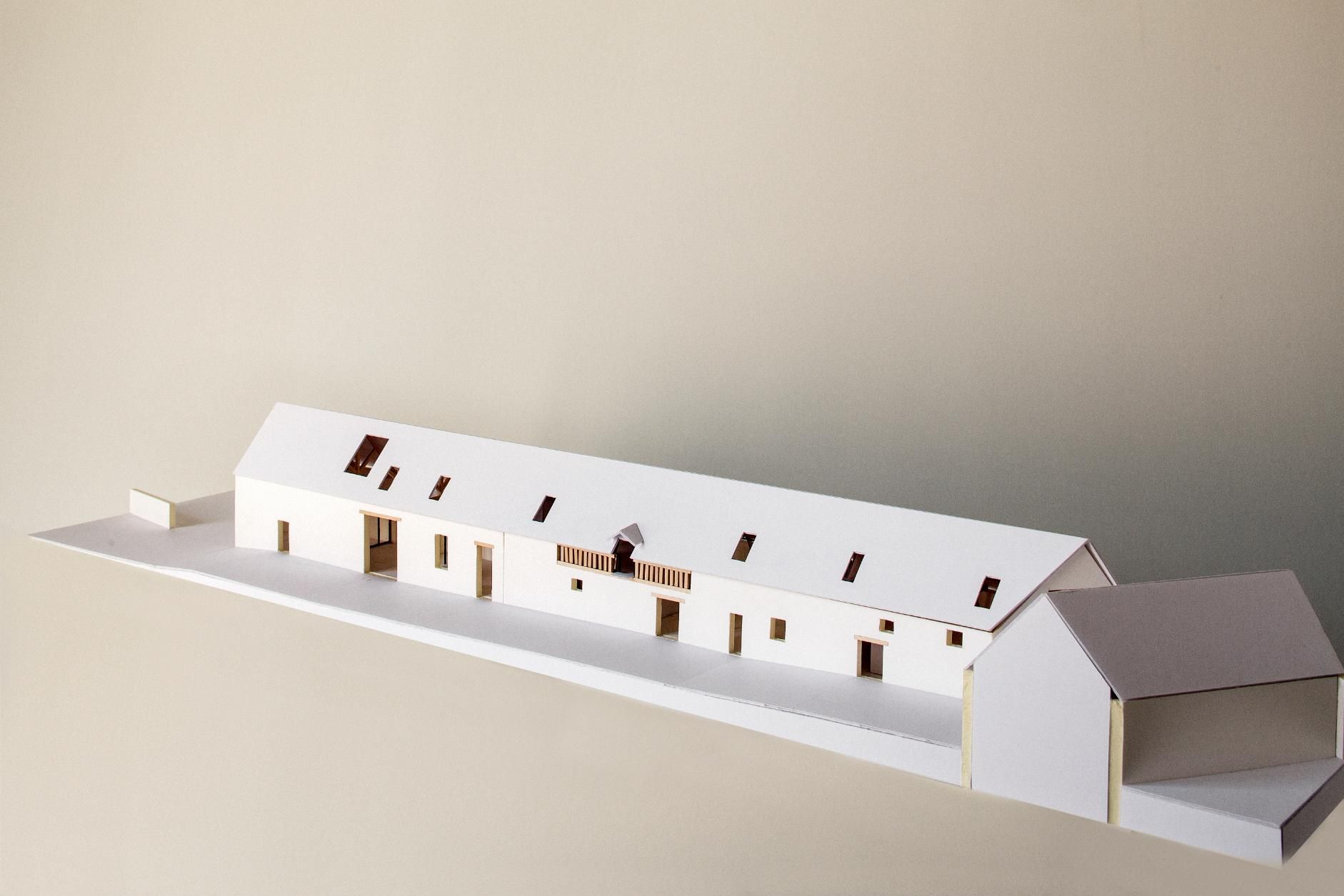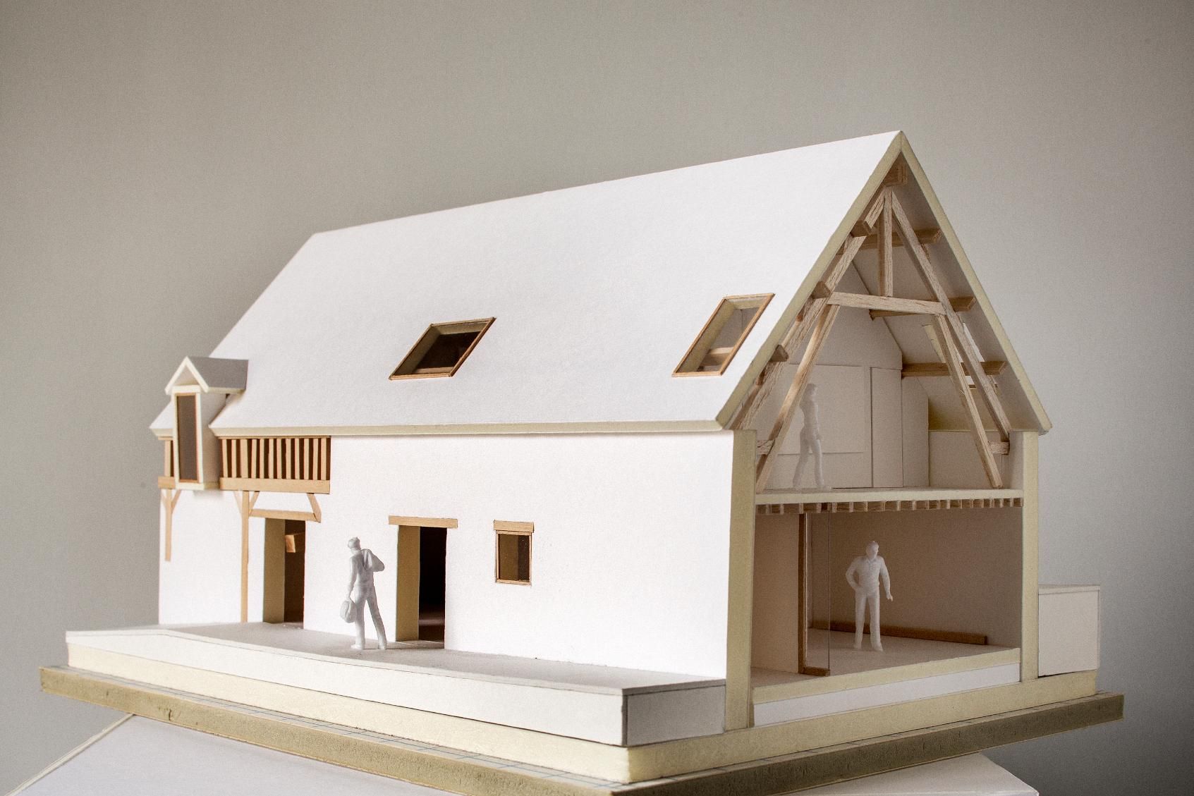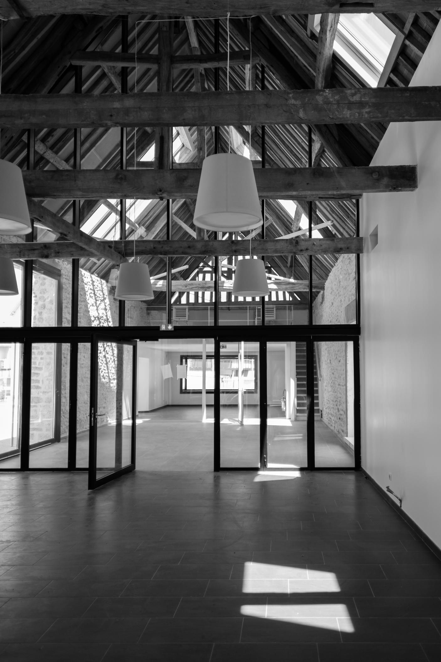 Au rez-de-chaussée, l’accès se fait par un préau couvert situé dans une partie de l’ancienne étable. La partie nord, accueille les activités de commerce. La halle couverte, le commerce, la salle de restaurant et la cuisine occupent la moitié de la longère. Cette fois ci, une verrière en toiture amène la lumière au coeur du projet.